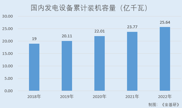 据国家统计局数据,2018-2022年,全国发电设备装机容量分别为19.00亿千瓦、20.11亿千瓦、22.01亿千瓦、23.77亿千瓦、25.64亿千瓦。