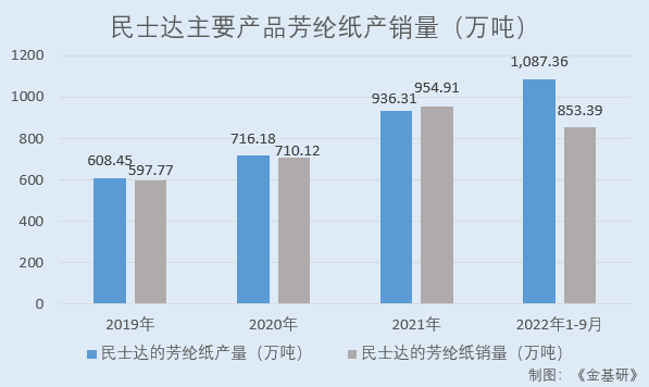 据招股书,2019-2021年及2022年1-9月,民士达的芳纶纸产量分别为608.45万吨、716.18万吨、936.31万吨、1,087.36万吨。同期,民士达的芳纶纸销量分别为597.77万吨、710.12万吨、954.91万吨、853.39万吨。