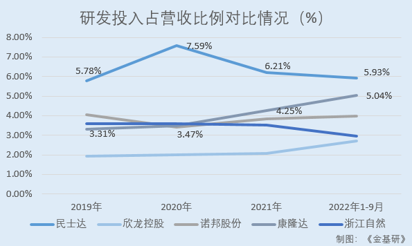 2019-2021年及2022年1-9月,民士达同行业可比公司欣龙控股的研发投入占比分别为1.92%、2.01%、2.07%、2.69%;诺邦股份的研发投入占比分别为4.04%、3.40%、3.84%、3.99%;康隆达的研发投入占比分别为3.31%、3.47%、4.25%、5.04%;浙江自然的研发投入占比分别为3.60%、3.58%、3.52%、2.96%。