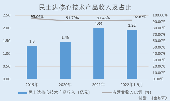 据招股书,2019-2021年及2022年1-9月,民士达核心技术产品收入分别为1.30亿元、1.46亿元、1.99亿元、1.92亿元,占营业收入的比例分别为95.06%、91.79%、91.45%、92.67%。