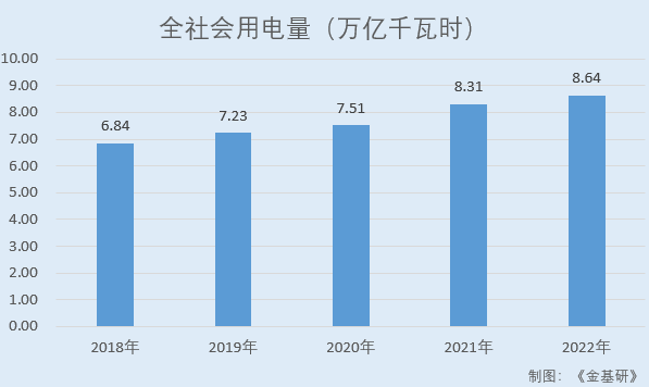 据国家统计局数据,2018-2022年,全社会用电量分别为6.31万亿千瓦时、6.84万亿千瓦时、7.23万亿千瓦时、7.51万亿千瓦时、8.31万亿千瓦时、8.64万亿千瓦时。