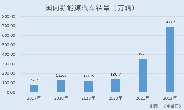 近年来,新能源汽车市场快速增长。据中汽协数据,2017-2022年,国内新能源汽车销量分别为77.7 万辆、125.6万辆、120.6万辆、136.7万辆、352.1万辆、688.7万辆,其中,2022年同比增长93.4%。