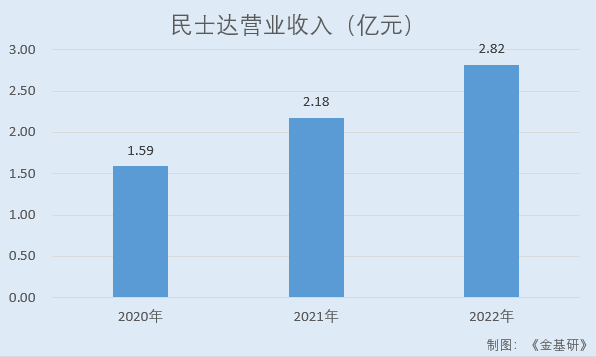 据招股书及年报数据,20,2-2022年,民士达营业收入分别为1.59亿元、2.18 亿元、2.82亿元,2021-2022年分别同比增长37.00%、29.48%。
