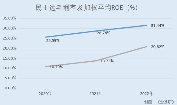 据东方财富choice数据,2020-2022年,民士达的毛利率分别为25.59%、28.76%、31.44%。同期,民士达加权平均净资产收益率分别为10.79%、13.73%、20.82%。