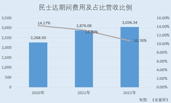 据招股书及年报数据,2020-2022年,民士达的期间费用分别为2,268.50万元、2,876.08万元、3,036.34万元,占营业收入的比例分别为14.27%、13.20%、10.76%。