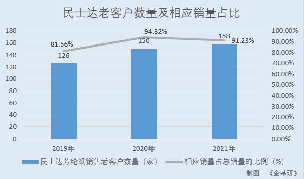 据招股书,2019-2021年,民士达芳纶纸销售老客户数量分别为126家、150家、158家,相应芳纶纸销量占各期芳纶纸总销量的比例分别为81.56%、94.32%、91.23%。