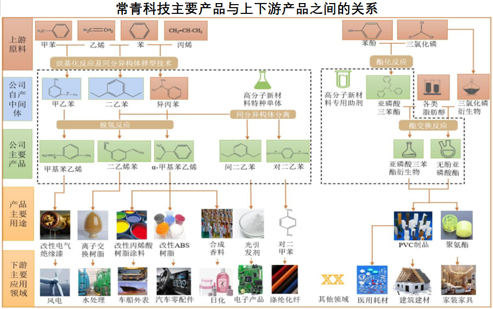 作为一家精细化工企业,常青科技主要产品为高分子新材料特种单体及专用助剂。其中,常青科技高分子新材料特种单体包括二乙烯苯、α-甲基苯乙烯和甲基苯乙烯等;高分子新材料专用助剂包括亚磷酸三苯酯系列、亚磷酸三苯酯衍生物系列、无酚亚磷酸酯系列。常青科技产品的终端应用领域涉及水处理、车船、家居、日化、风电、电子建筑建材、医用耗材等广阔领域。