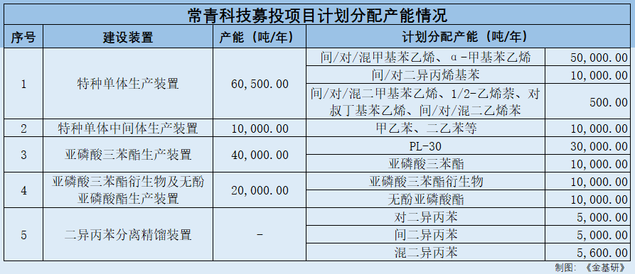项目建设的特种单体生产装置主要新增甲基苯乙烯(间/对/混)、α-甲基苯乙烯年产能5万吨,二异丙烯基苯(间/对)年产能1万吨;特种单体中间体生产装置将新增二乙苯、甲乙苯年产能1万吨;亚磷酸三苯酯生产装置将新增PL-30年产能3万吨,亚磷酸三苯酯年产能1万吨;亚磷酸三苯酯衍生物及无酚亚磷酸酯生产装置将新增亚磷酸三苯酯衍生物年产能1万吨,无酚亚磷酸酯年产能1万吨。