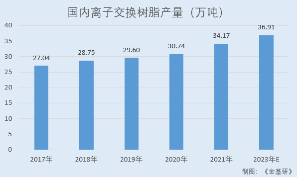 据中国膜工业协会离子交换树脂分会数据,2017-2021年,国内离子交换树脂产量分别为27.04万吨、28.75万吨、29.60万吨、30.74万吨、34.17万吨,呈逐年上涨趋势。预计2023年产量将达36.91万吨。
