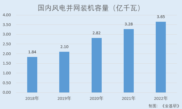 近年来,国内风力发电发展迅速。据国家统计局数据,2018-2022年各期末,国内风电并网装机容量分别为1.84亿千瓦、2.10亿千瓦、2.82亿千瓦、3.28亿千瓦、3.65亿千瓦,年复合增长率达18.68%。