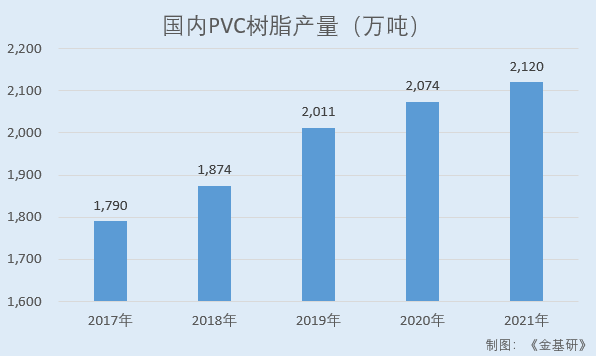 据中国塑料加工协会助剂专业委员会数据,2017-2021年,国内PVC树脂产量分别为1,790万吨、1,874万吨、2,011万吨、2,074万吨、2,120万吨,产量逐年稳定提升。