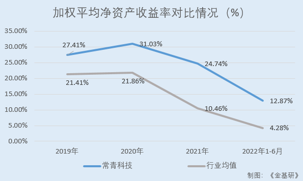 据招股书,2019-2022年,常青科技加权平均ROE分别为26.94%、31.19%、24.55%、25.63%。其中,2022年1-6月,常青科技加权平均ROE为12.93%。