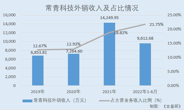 2019-2021年及2022年1-6月,常青科技外销收入分别为6,853.81万元、7,264.60万元、14,249.95万元、9,612.68万元,占同期主营业务收入的比例分别为12.67%、12.93%、18.82%、21.75%,外销收入及占比均呈上涨趋势。