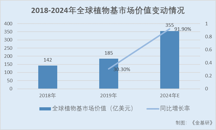 据艾媒网数据显示,2019年全球植物基市场价值达185亿美元,较2018年增加了43亿美元,同比增长30.3%,预计2024年全球植物基市场价值将达到355亿美元。