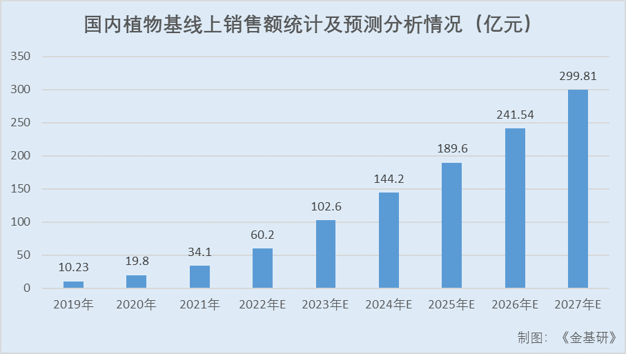 据中研普华产业研究院数据显示,2019-2027年E,国内植物基线上销售额分别为10.23亿元、19.8亿元、34.1亿元、60.2亿元、102.6亿元、144.2亿元、189.6亿元、241.54亿元、299.81亿元。