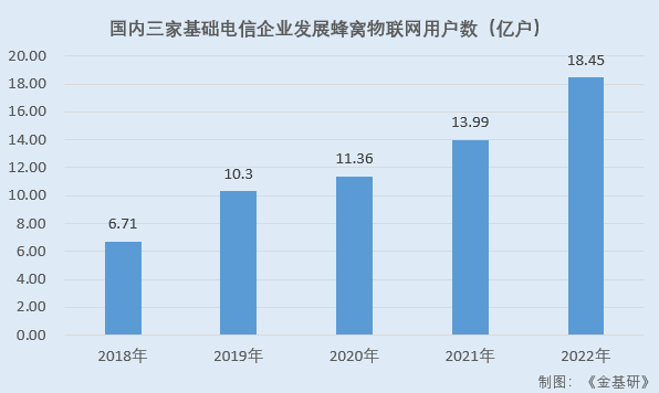 另据工信部数据,2018-2022年各期末,国内三家基础电信企业发展蜂窝物联网用户分别为6.71亿户、10.30亿户、11.36亿户、13.99亿户、18.45亿户。其中,2022年三家基础电信企业发展蜂窝物联网用户较移动电话用户数高1.61亿户,首次实现“物超人”。