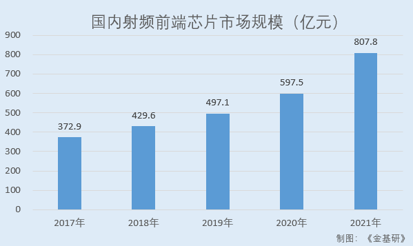 据共研网数据,2017-2021年,国内射频前端芯片市场规模分别为372.9亿元、429.6亿元、497.1亿元、597.5亿元、807.8亿元。预计到2023年国内射频前端芯片总体规模将达1,045.2亿元,到2025年将增长至1,401.6亿元。