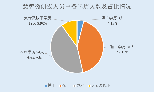 截至2022年6月30日,慧智微共有研发人员192人,占员工总人数的69.82%。其中,博士学历的8人,占研发人员比例4.17%;硕士学历的81人,占研发人员比例42.19%;本科学历的84人,占研发人员比例43.75%。