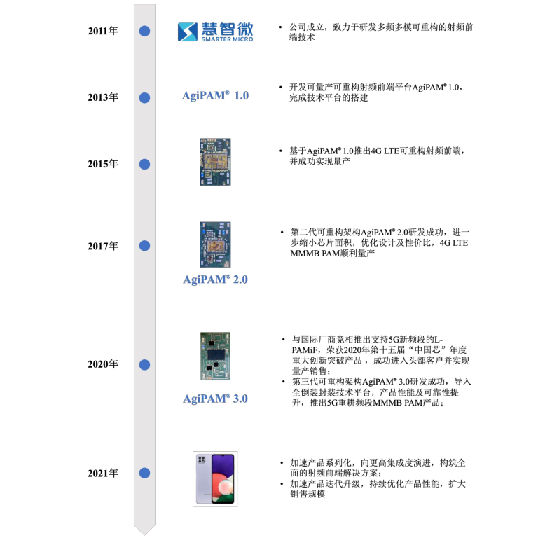 2011年慧智微成立,领先投入自有知识产权射频前端技术平台AgiPAM®1.0的搭建。