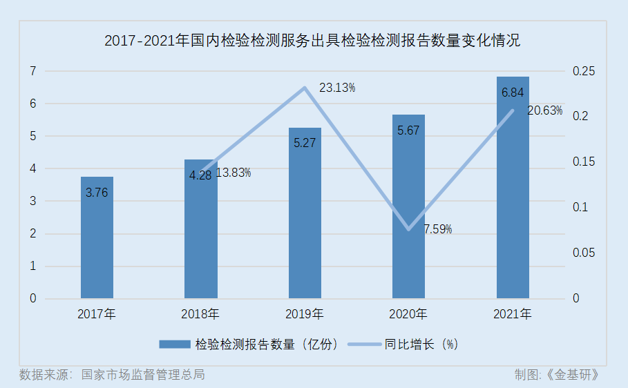 在深化实施供给侧结构性改革、深化质量认证制度改革等背景下,国内经济社会对产品质量的要求在不断提高,各个行业对检验检测服务的需求也在不断扩大。2021年,国内检验检测服务行业的规模达到了4,090.22亿元,产出检验检测报告6.84亿份,平均每天对社会出具各类报告187.31万份,检验检测机构的数量也达到了51,949家。
