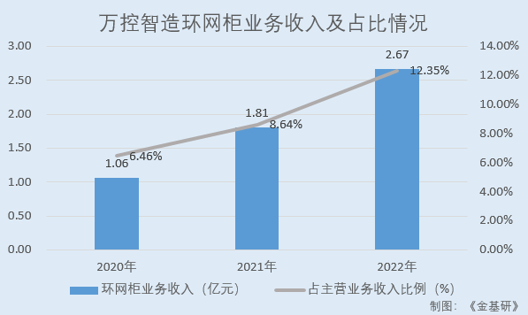 2020-2022年,万控智造环网柜业务实现销售收入分别为1.06亿元、1.81亿元、2.67亿元,占主营业务收入的比例分别为6.46%、8.64%、12.35%。