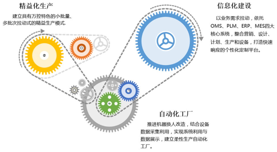 在信息化方面,万控智造以客户需求为中心,以精益化为指导,自主开发实施了PLM、ERP、OMS和MES系统等相融合、互联互通的信息化协同平台,形成以数据、业务和技术为基础的三大中台,实现了底层业务数据的互通,实现大规模个性化定制全程线上管控模式。