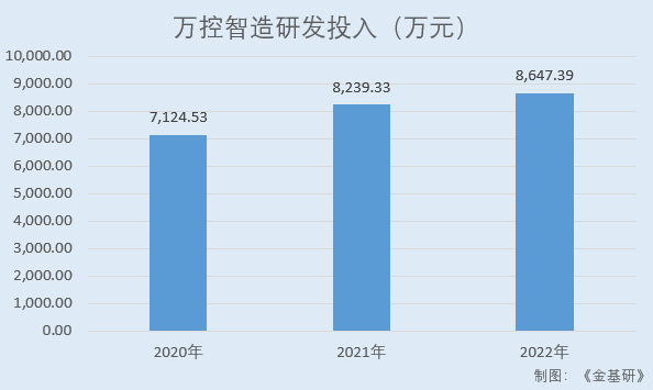 在研发投入方面,2020-2022年,万控智造的研发投入分别为7,124.53万元、8,239.33万元、8,647.39万元,呈逐年上涨趋势。