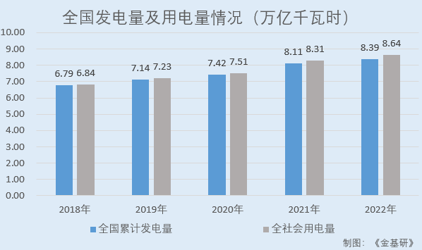 2018-2022年,全国累计发电量分别为6.79万亿千瓦时、7.14万亿千瓦时、7.42万亿千瓦时、8.11万亿千瓦时、8.39万亿千瓦时;全社会用电量分别为6.84万亿千瓦时、7.23万亿千瓦时、7.51万亿千瓦时、8.31万亿千瓦时、8.64万亿千瓦时。