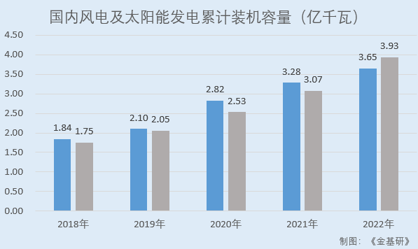 据国家能源局数据,2018-2022年全国风电累计装机容量分别为1.84亿千瓦、2.10亿千瓦、2.82亿千瓦、3.28亿千瓦、3.65亿千瓦,年均复合增长率达18.68%;国内太阳能累计装机容量分别为1.75亿千瓦、2.05亿千瓦、2.53亿千瓦、3.07亿千瓦、3.93亿千瓦,年均复合增长率达22.42%。