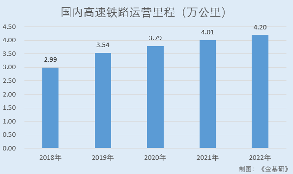 据交通运输部数据,2018-2022年,国内高速铁路运营里程分别为2.99万公里、3.54万公里、3.79万公里、4.01万公里、4.20万公里。其中,2022年新增高铁运营里程2,082公里。