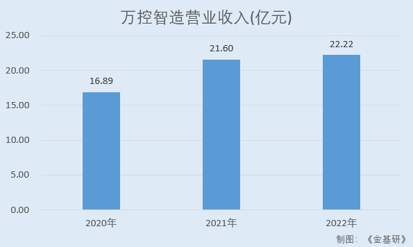 2020-2022年,万控智造实现营业收入分别为16.89亿元、21.60亿元、22.22亿元,年均复合增长率为14.69%。