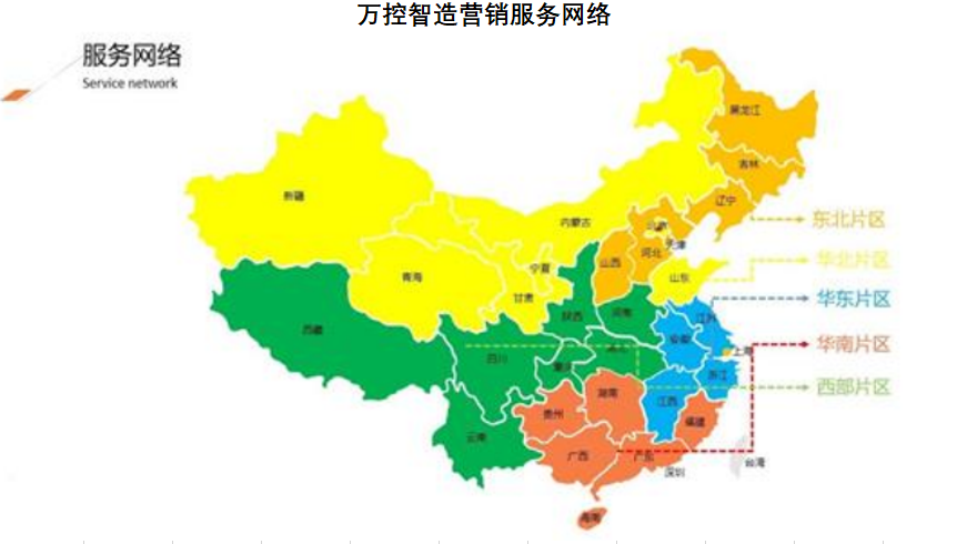 在国内市场,目前万控智造已按照“营销中心—大区销售—地方办事处”的三级组织形式设立直属的营销服务网络,设立华东、华南、东北、华北和西部五大营销片区,在全国各大重点城市和地区设立近80个营销地区(办事处)。