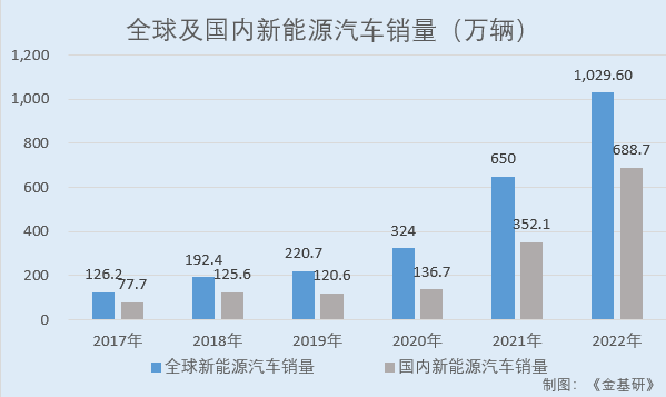 另据中汽协数据,2017-2022年,国内新能源汽车销量分别为77.7万辆、125.6万辆、120.6万辆、136.7万辆、352.1万辆、688.7万辆,其中,2020-2022年,国内新能源汽车渗透率分别为5.4%、19.1%、25.6%。