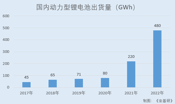 据GGII数据,2017-2022年,国内动力型锂电池出货量分别为45GWh、65GWh、71GWh、80GWh、220GWh、480GWh。