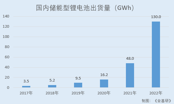 据GGII数据,2017-2022年,国内储能型锂离子电池出货量分别为3.5GWh、5.2GWh、9.5GWh、16.2GWh、48.0GWh、130.0GWh,2022年,国内储能型锂离子电池出货量同比增长170.83%。