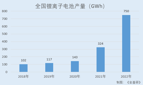 据GGII及工信部数据,2018-2022年,全国锂离子电池产量分别为102GWh、117GWh、143GWh、324GWh、750GWh。其中,2022年全国锂离子电池产量同比增长超过130%。