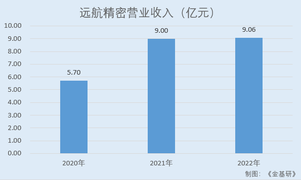 2020-2022年,远航精密营业收入分别为5.70亿元、9.00亿元、9.06亿元。