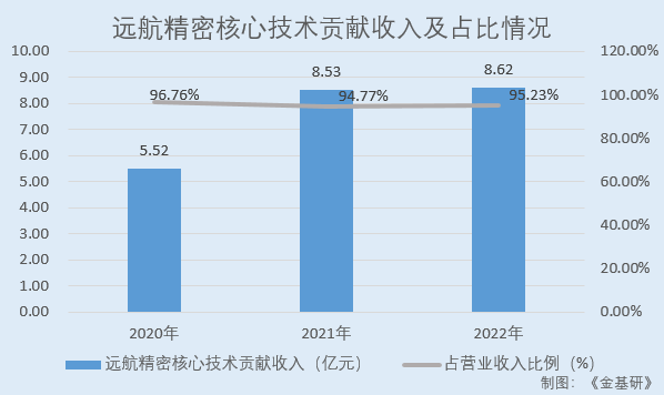 2020-2022年,远航精密各期核心技术贡献收入分别为5.52亿元、8.53亿元、8.62亿元,占营业收入的比例分别为96.76%、94.77%、95.23%。