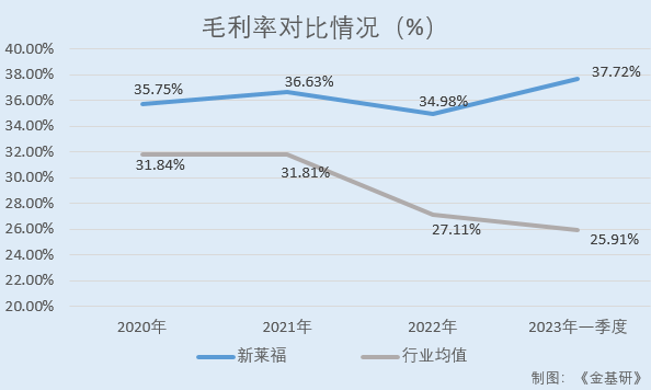 据东方财富choice数据,2020-2022年及2023年一季度,新莱福毛利率分别为35.75%、36.63%、34.98%、37.72%。