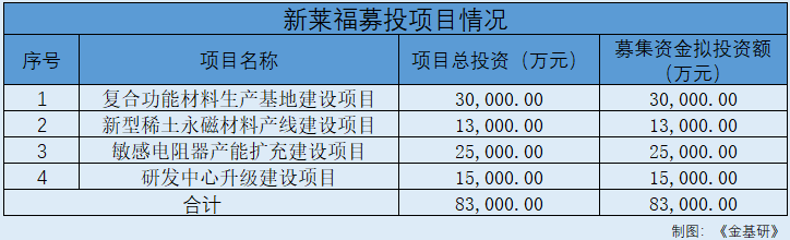 此番上市,新莱福拟募集资金8.30亿元分别用于复合功能材料生产基地建设项目、新型稀土永磁材料产线建设项目、敏感电阻器产能扩充建设项目、研发中心升级建设项目。