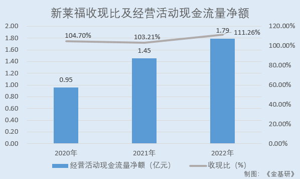 2020-2022年,新莱福销售商品、提供劳务收到的现金占营业收入的比例分别为104.70%、103.21%、111.26%;经营活动产生的现金流量净额分别为0.95亿元、1.45亿元、1.79亿元;货币资金分别为0.99亿元、1.05亿元、1.10亿元。