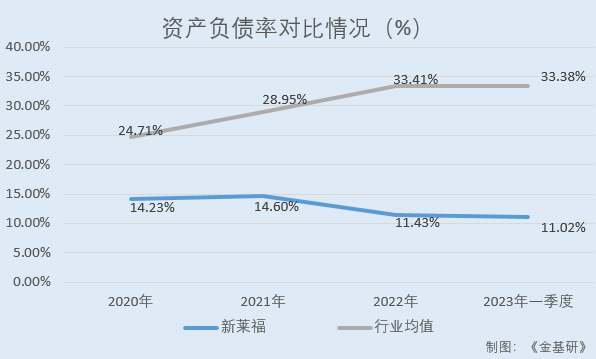 据东方财富choice数据,2020-2022年及2023年一季度,新莱福资产负债率分别为14.23%、14.60%、11.43%、11.02%。