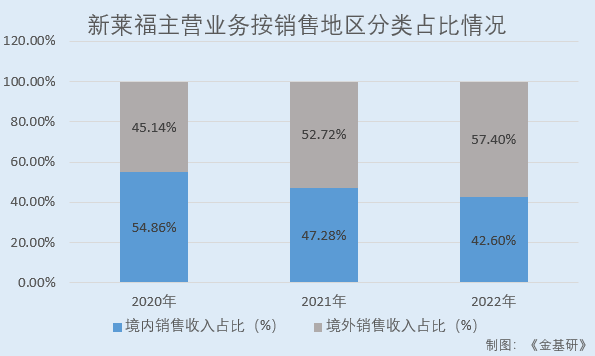 2020-2022年,新莱福境内销售收入分别为3.27亿元、3.68亿元、3.03亿元,占主营业收入的比例分别为54.86%、47.28%、42.60%;境外销售收入分别为2.69亿元、4.10亿元、4.08亿元,占主营业收入的比例分别为45.14%、52.72%、57.40%。