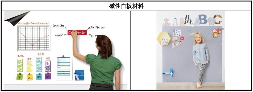 在吸附功能材料领域,新莱福最早于2007年提出吸附式广告展示系统的概念,并成功开发出柔性宽幅、可直接印刷的广告用磁胶材料,大大拓展了吸附功能材料的应用边界。新莱福生产的广告用磁胶材料产品目前最宽可达1,626mm,厚度最薄可达0.08mm,均为行业先进水平。新莱福的广告用磁胶材料可直接印刷、喷绘,即印即用、快速换新、无毒环保,被广泛应用于广告展示、家居装饰、办公教育等场景。