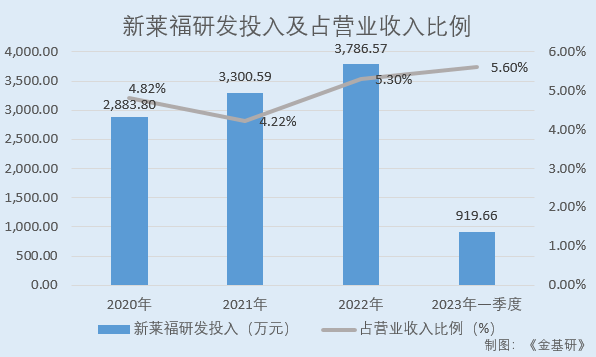 2020-2022年及2023年一季度,新莱福的研发投入分别为2,883.80万元、3,300.59万元、3,786.57万元、919.66万元,分别占当期营业收入比例为4.82%、4.22%、5.30%、5.60%。