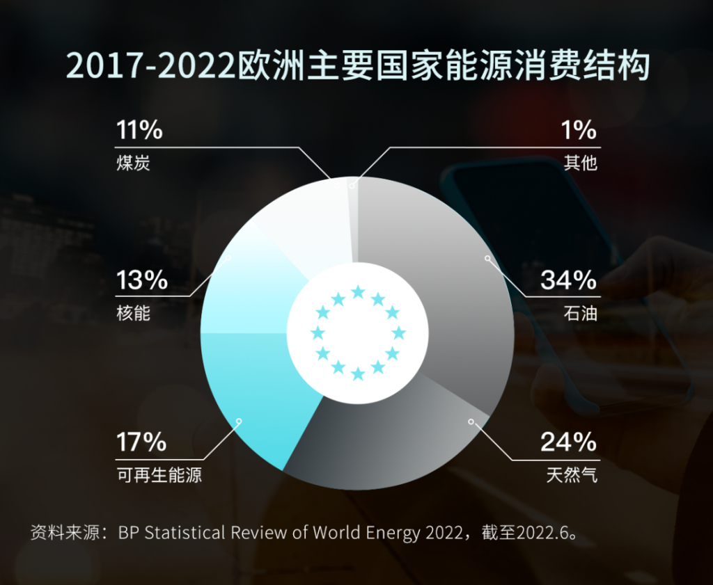 实际上,导致欧洲能源危机的原因,远不止极端天气这么简单。根据欧洲委员会披露的信息,在过去五年欧洲的能源消费结构中,化石能源的占比达60%,且天然气、石油和煤炭的进口比例分别达90%、97%和70%。换句话说,欧洲的能源主要依赖于进口。