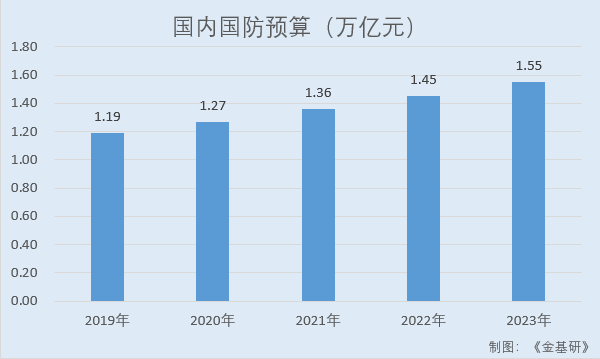 据财政部部数据,2019-2023年,国内国防预算分别为1.19万亿元、1.27万亿元、1.36万亿元、1.45万亿元、1.55万亿元。