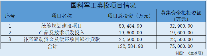此番上市,国科军工拟募资7.50亿元分别用于统筹规划建设项目、产品及技术研发投入、补充流动资金及偿还项目银行贷款。