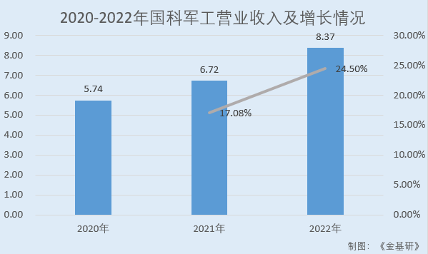 2020-2022年,国科军工营业收入分别为5.74亿元、6.72亿元、8.37亿元,2021-2022年分别同比增长17.08%、24.50%。
