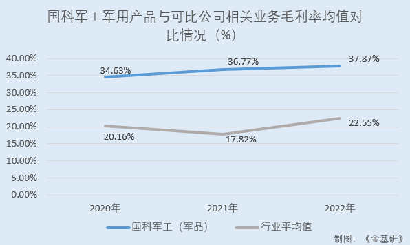 从毛利率情况看,近年来国科军工的军用产品毛利率高于同行业可比公司相关业务均值。